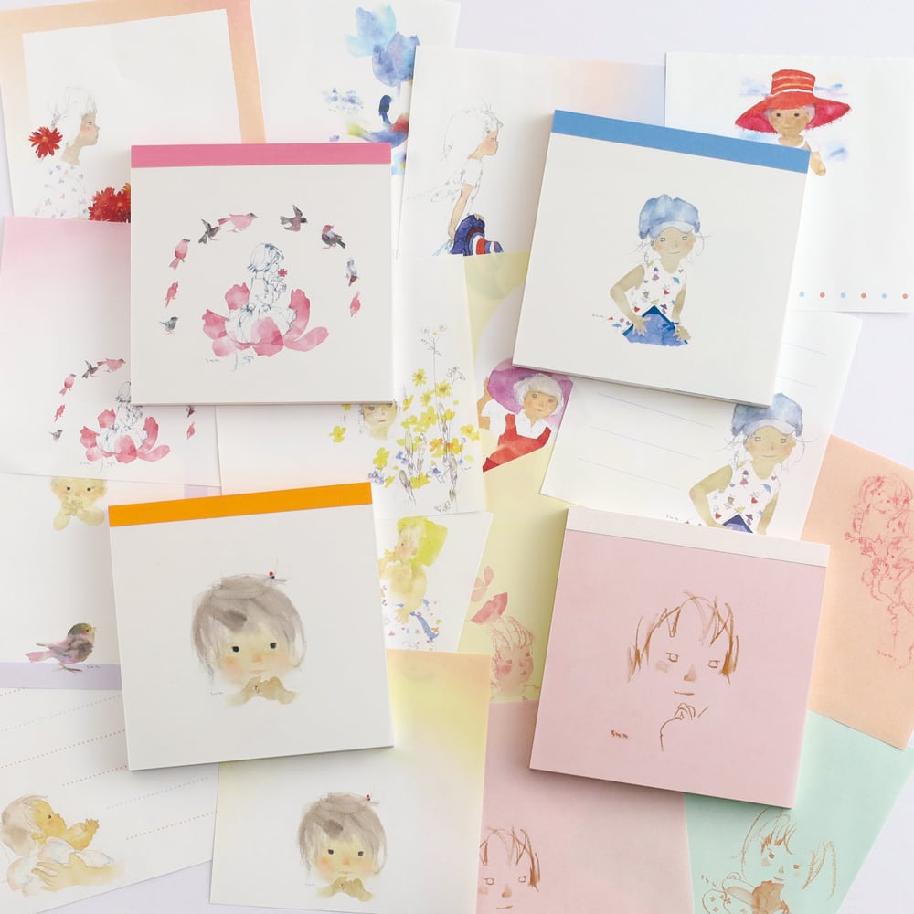 いわさきちひろさんの4種類の絵柄が楽しめる、スクエアタイプのメモパッドです