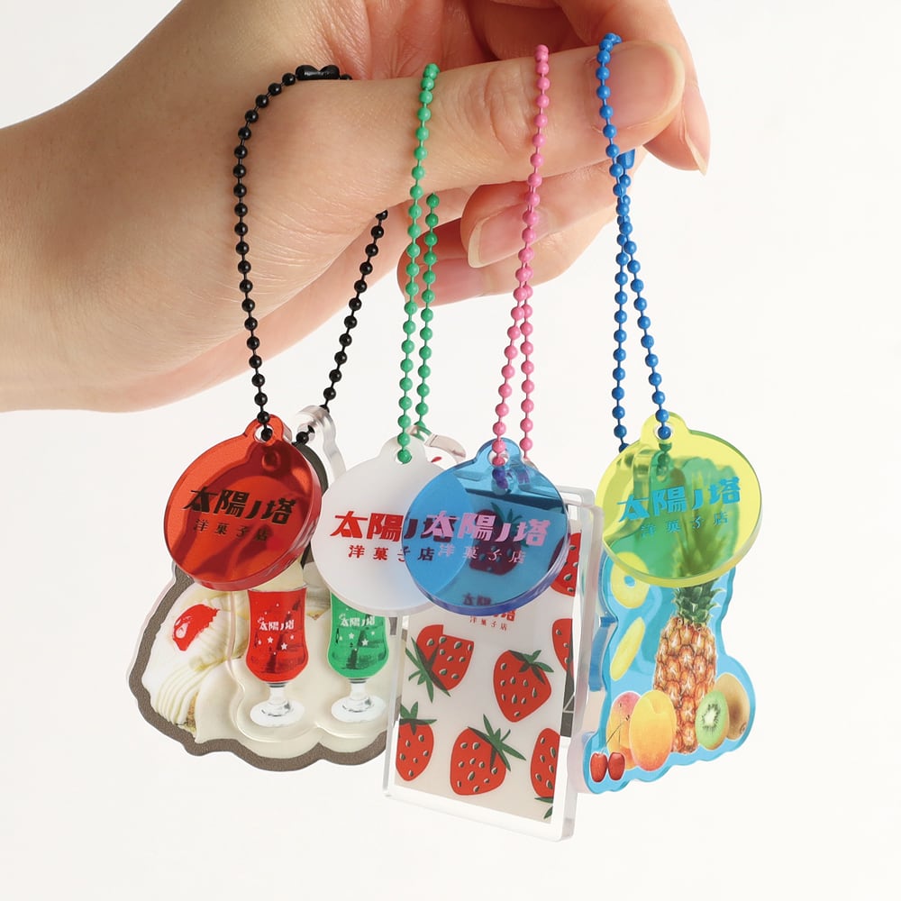 太陽ノ塔洋菓子店で人気のこだわりのケーキや焼き菓子、クリームソーダなどがアクリルキーホルダーになりました。